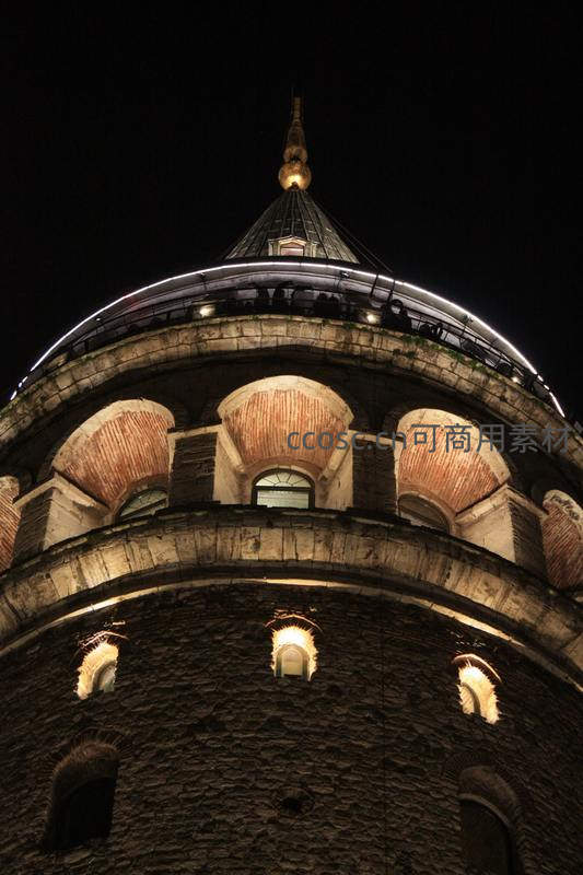 夜晚的加拉达塔在暖黄灯光映衬下,砖石结构与拱形窗洞细节清晰可见,顶部金顶在黑暗中熠熠生辉,充满历史厚重感。