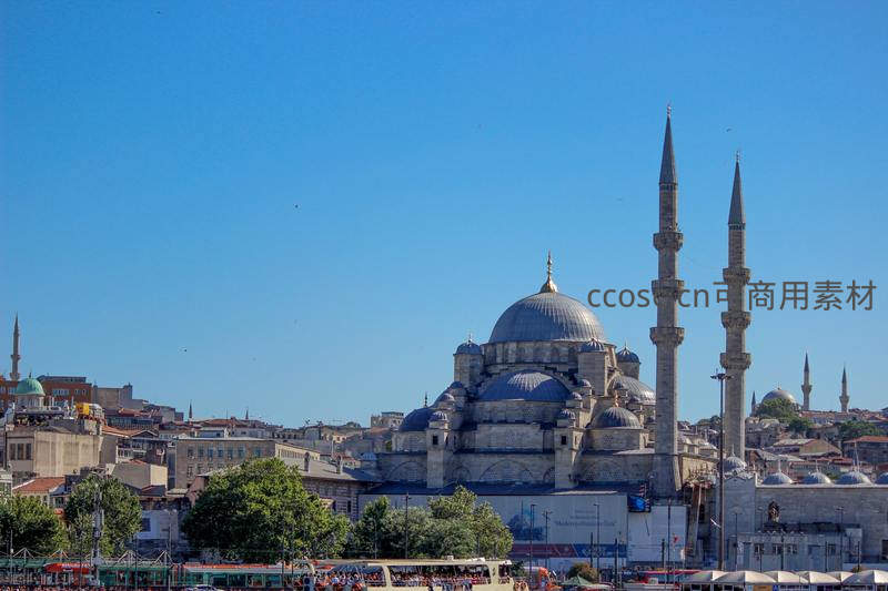 蓝天下的宏伟清真寺与城市风光