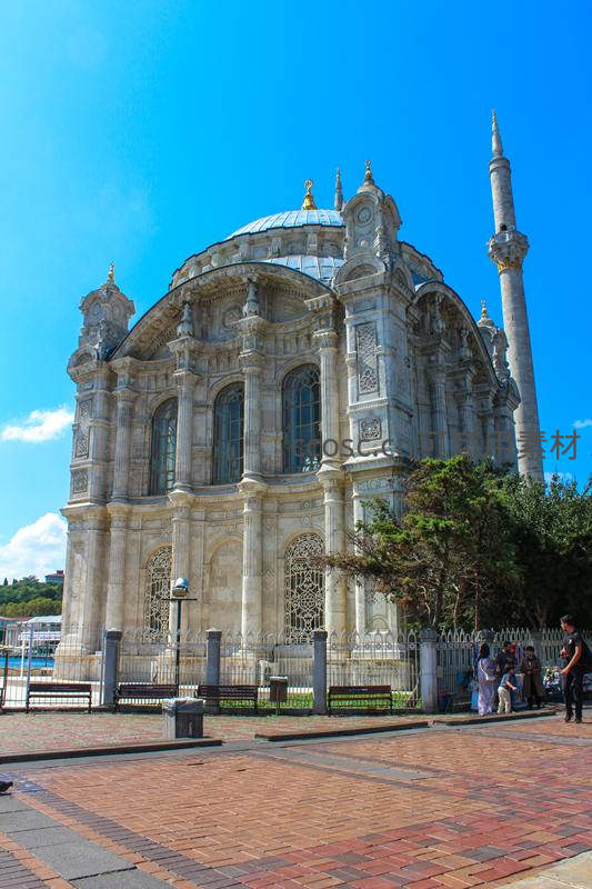 在晴朗的蓝天下,一座精美的奥斯曼风格清真寺矗立着,其华丽的穹顶与高耸的宣礼塔构成经典景观,吸引游客驻足欣赏。
