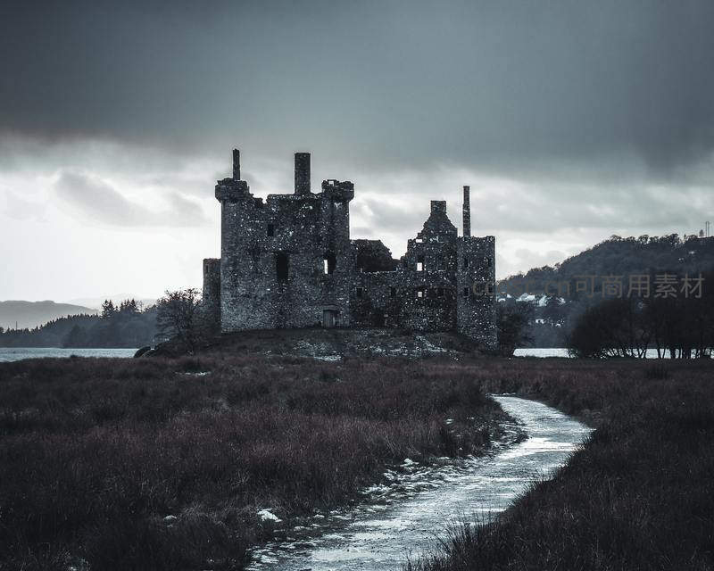 一座饱经风霜的中世纪城堡矗立在湖边荒原上,乌云压顶,一条小径通向它,营造出一种神秘、苍凉而充满故事感的氛围。