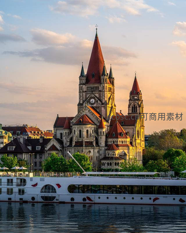 金色夕照洒落宏伟哥特教堂尖塔,河面波光粼粼,白色游船静静停泊,构成一幅宁静而神圣的城市河岸画卷。