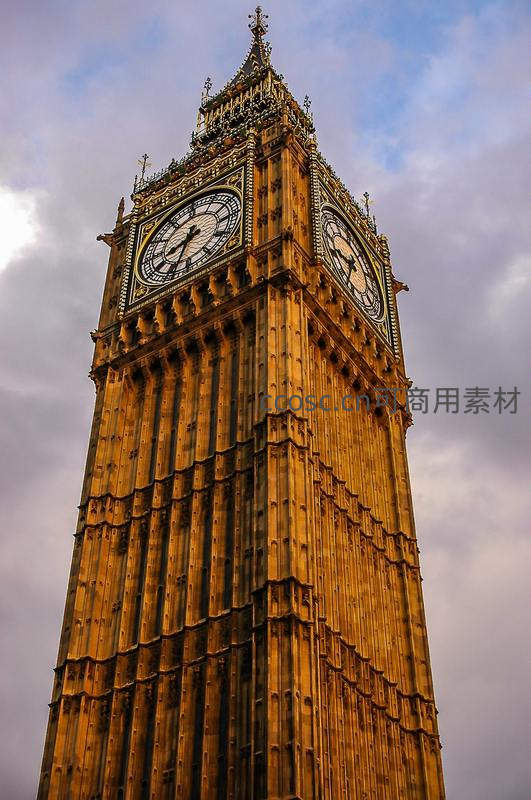 从低角度仰拍的大本钟巍峨壮观,其精美的哥特式雕花和巨大的钟面在多云天空下更显庄严,是伦敦乃至英国最具代表性的历史建筑之一。