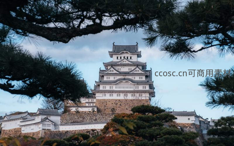 巍峨的姬路城天守阁在蓝天白云下洁白如雪,苍劲的松枝从前景伸展,巧妙框住这座世界遗产。古朴的石墙与精致的屋檐,展现日本战国时代的建筑智慧。