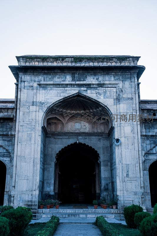 灰白色石块垒成的宏伟拱门通往幽暗殿内,门前绿植整齐,青苔爬满墙头,透露出岁月沉淀的宁静与庄重。