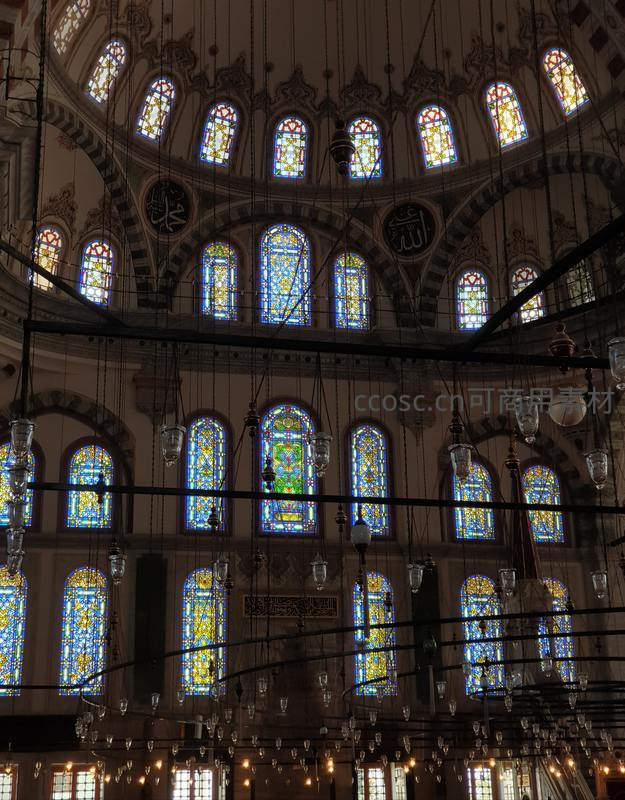 宏伟的清真寺内部,高耸的穹顶下悬挂着无数盏古典吊灯,彩色玻璃窗透入斑斓光线,营造出庄严肃穆又充满艺术感的神圣空间。