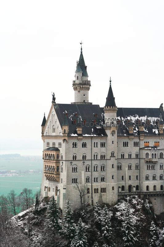 白雪覆盖的新天鹅堡,童话般的尖塔耸立山巅