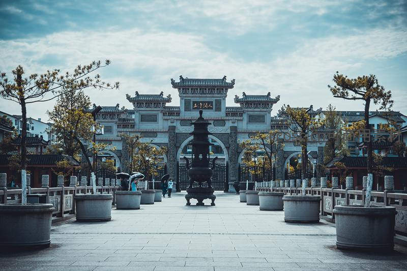 青石铺就的庭院中央摆放着一座古朴香炉,两侧排列着盆栽树木,背景是气势恢宏的传统牌楼,整体氛围宁静而充满历史感。