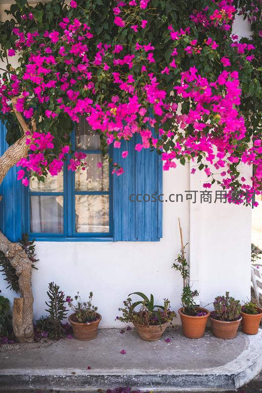 鲜艳的紫红色三角梅从白色墙壁上倾泻而下,环绕着蓝色木质百叶窗,地面整齐排列陶盆绿植,营造出浓郁的地中海式田园诗意。
