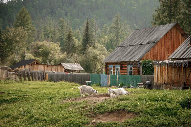 在青翠山林环抱的乡间,一座古朴木屋静立,几只白羊在门前绿茵上悠闲吃草,构成一幅宁静祥和的田园牧歌画卷。