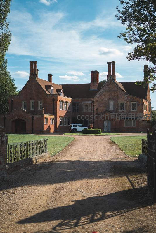 一座宏伟的红砖古宅在晴朗天空下显得格外庄重,门前车道通向拱门,白色越野车静停院中,四周绿树环绕,光影斑驳,尽显英伦乡村风情。