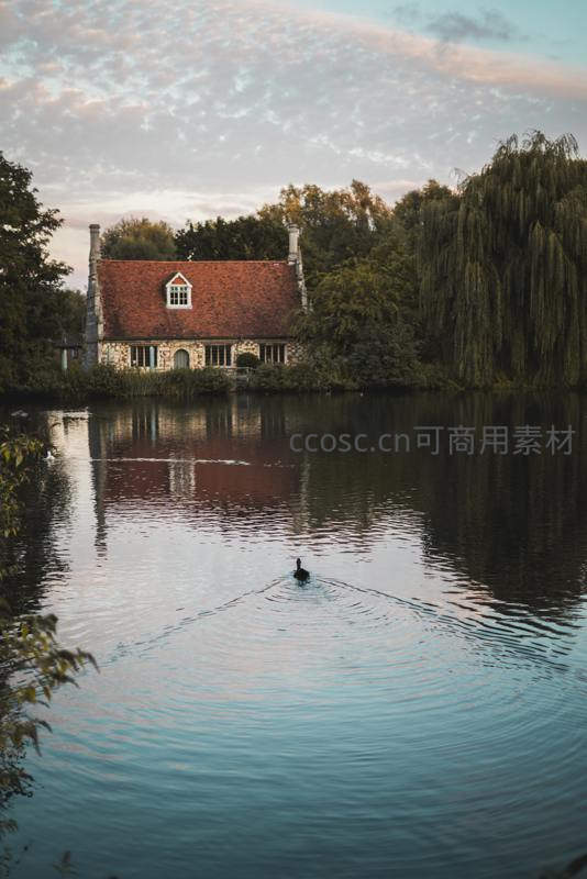 夕阳西下,一座典雅的石砌小屋静卧湖畔,屋顶红瓦与天光云影交相辉映。一只水鸟悠然游过,荡起圈圈涟漪,垂柳轻拂水面,构成一幅诗意盎然的田园画卷。