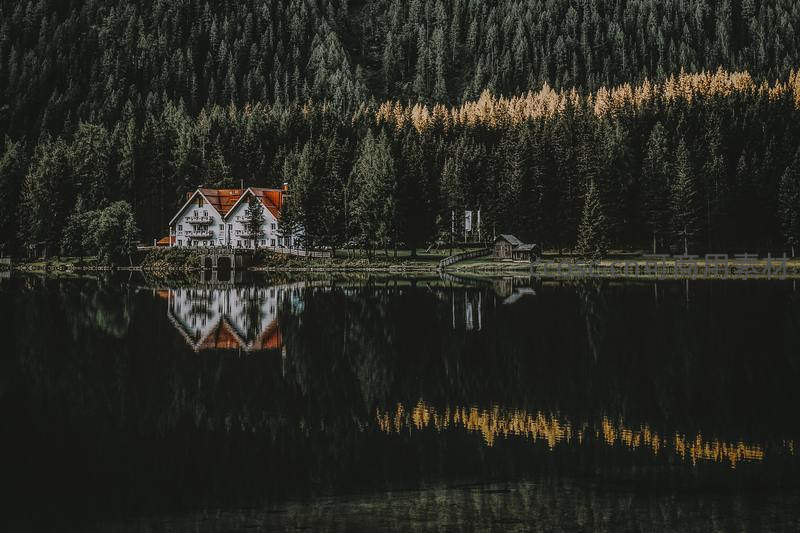 浓密的深绿色针叶林下,一座小屋临水而建,其倒影在幽暗湖面上若隐若现,远处树梢泛着金光,整体色调沉郁,营造出一种神秘而静谧的山林氛围。