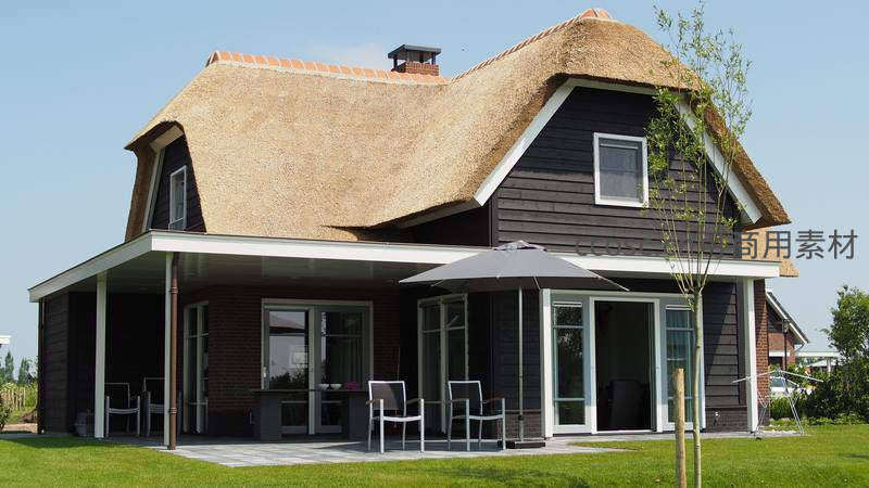 一栋拥有传统茅草屋顶的现代风格黑色木屋,前院设有遮阳伞和桌椅,是享受乡村宁静生活的理想居所。