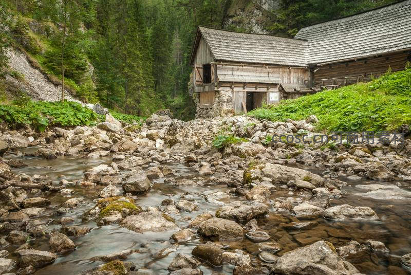 山涧溪流穿行古朴木屋旁