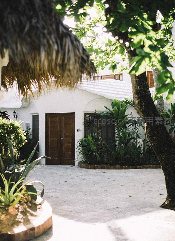 阳光透过茂密树叶洒在白色建筑上,棕榈与多肉植物环绕着木质大门,营造出一个充满热带风情的悠闲度假角落。
