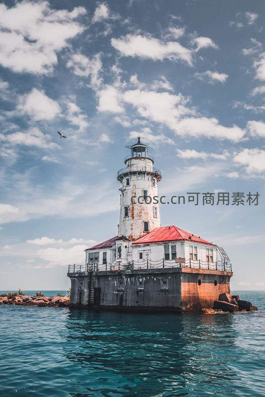 一座古老的白色灯塔矗立在碧蓝海水中,红色屋顶与锈迹斑驳的墙体诉说着岁月沧桑,头顶白云朵朵,一只海鸥掠过,画面静谧而壮美。