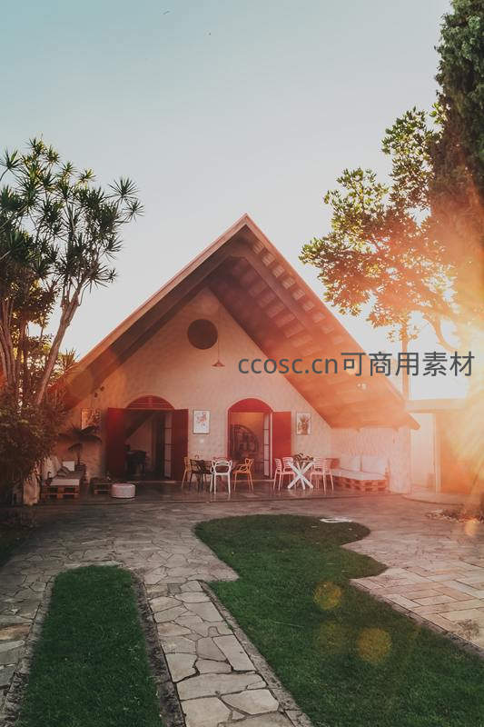 午后阳光透过树梢洒在宁静的庭院,石板小径蜿蜒穿过绿茵,白色桌椅静候主人,构成一幅充满生活气息的惬意居家图景。