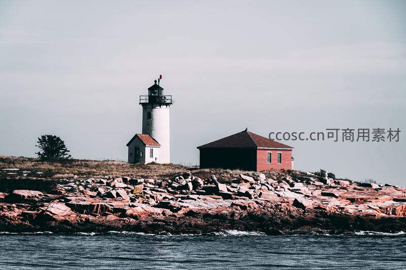 一座白色灯塔与红砖小屋静立于荒凉的岩石小岛上,灰白天空下波涛拍岸,象征着航海者的指引与岁月沉淀的孤寂之美。