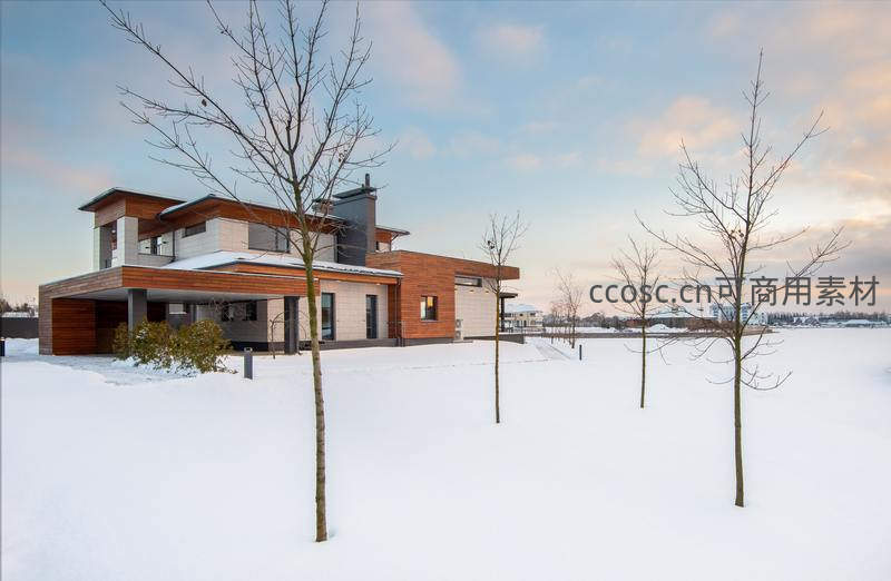 一座现代设计的别墅被皑皑白雪覆盖,木质与石材外墙在冬日暖阳下显得格外温馨,光秃的树木点缀其间,营造出静谧的北欧风情。