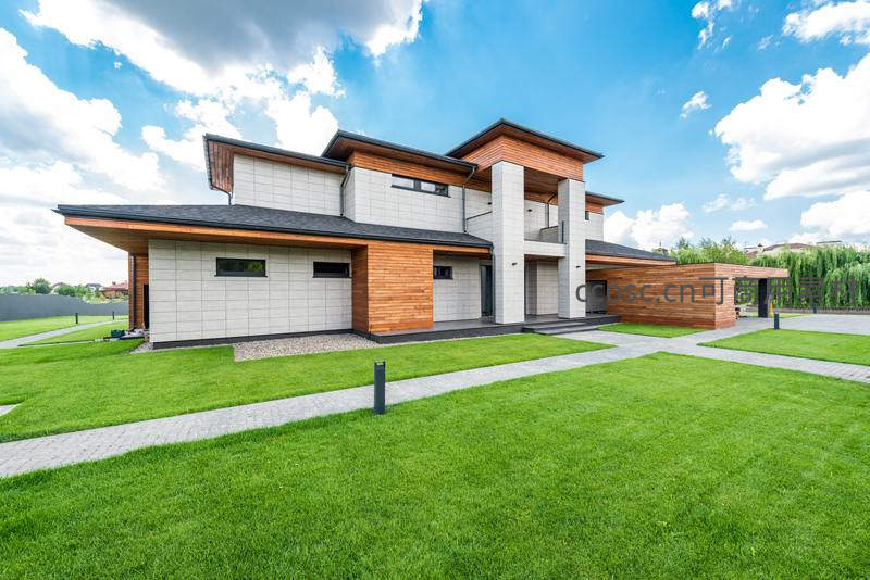 现代风格别墅,绿茵环绕,蓝天白云下尽显优雅