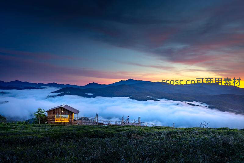 清晨,山顶之上云海翻腾,一座温暖灯光的木屋静立其中,远处群山在朝霞映衬下轮廓分明。游客伫立观景台,沉浸在这如梦似幻的壮丽自然奇观之中。