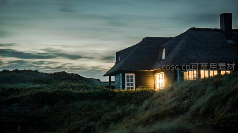 黄昏草屋灯火温暖如家