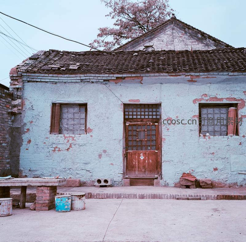 斑驳老宅门前院,褪色墙皮诉说岁月沧桑痕迹