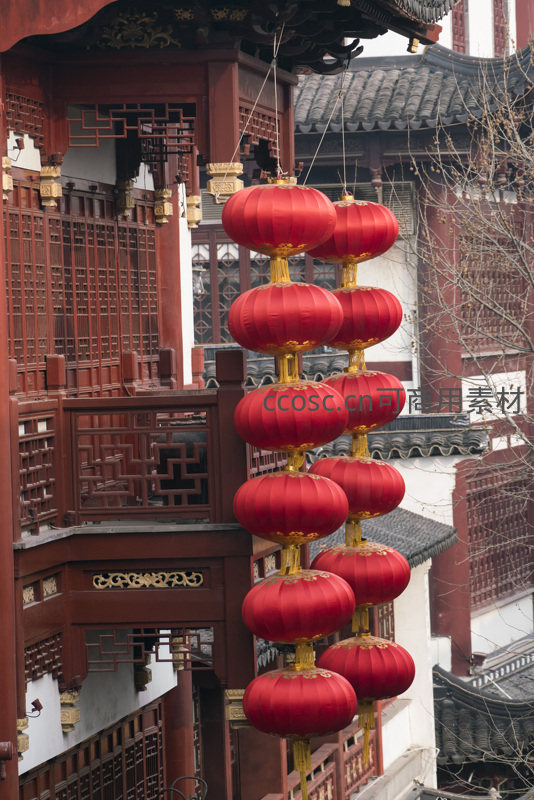 一串串饱满的红色灯笼从古楼的飞檐下垂落,与深褐色的木质栏杆和窗棂构成经典画面,背景中白墙黛瓦的屋宇错落有致,展现出中国传统建筑群落的层次美与节日气氛。