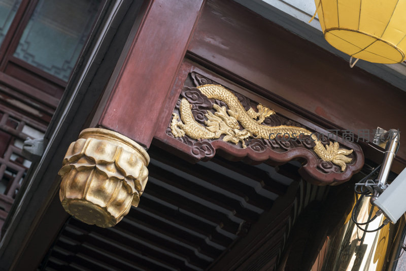 古建筑飞檐斗拱上的金色龙雕细节