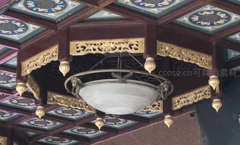 古典藻井与雕花梁架下的复古吊灯