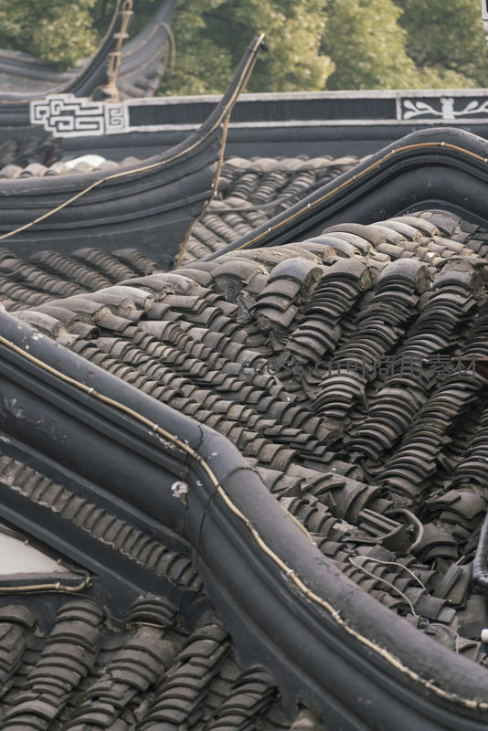 层层叠叠的青灰色瓦片铺就传统中式屋顶,屋脊线条流畅优美,展现出古建筑屋顶结构的韵律感与岁月沉淀的质朴美感。