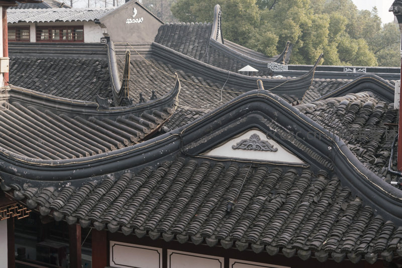 古建筑飞檐翘角与青瓦屋顶的细节特写