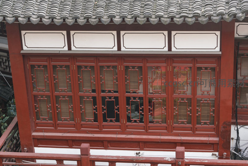 整齐划一的红色木质窗棂搭配灰瓦屋顶,构图对称严谨,体现了中式园林建筑追求的秩序美与和谐感。