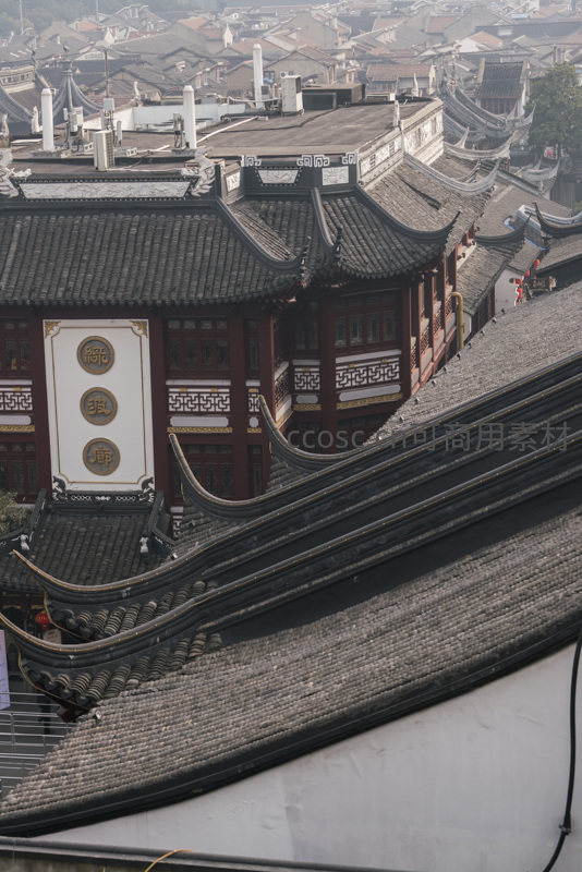 从高空俯瞰,层层叠叠的黑色瓦片与翘起的飞檐勾勒出古典建筑群的轮廓,展现了中国传统建筑的精妙结构与深厚文化底蕴。