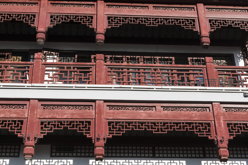 多层朱红色木质栏杆错落有致,镂空雕花图案细腻繁复,在阳光下更显庄重典雅,是传统中式楼阁不可或缺的经典元素。