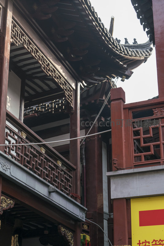 古建筑层叠的飞檐与雕花栏杆细节特写