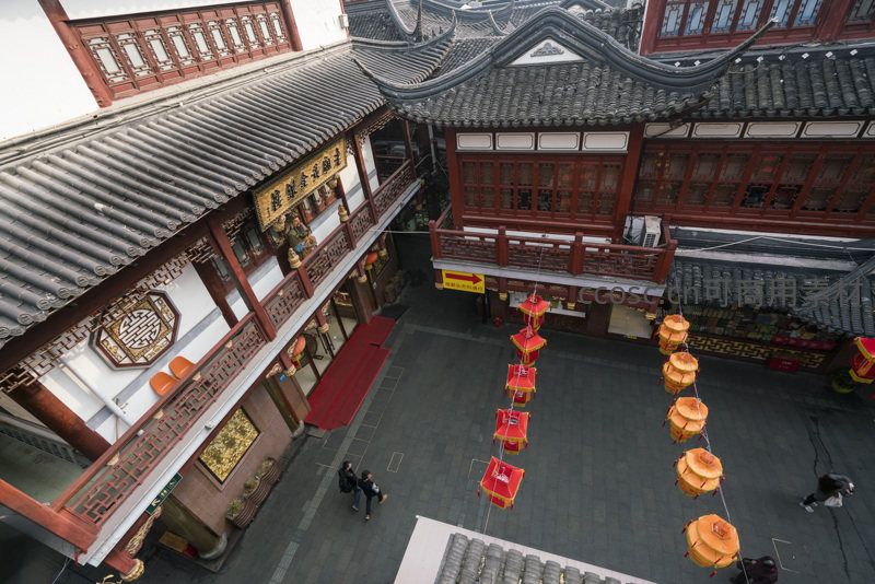 从高处俯视,传统中式庭院结构严谨,两侧廊庑对称,中央空地悬挂着整齐排列的红色灯笼,几位游客穿行其中,为静谧的古建增添了一丝生活气息。
