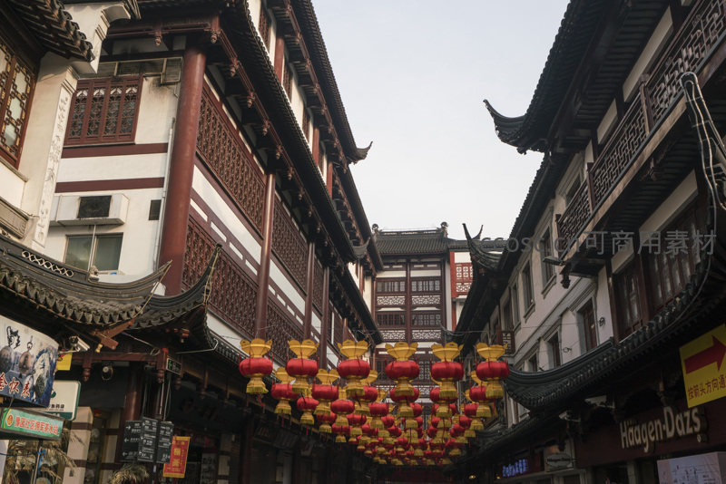 狭窄的古街巷道两侧是典型的中式木结构建筑,头顶悬挂着成排的红黄灯笼,形成视觉焦点,营造出浓厚的传统节庆氛围。