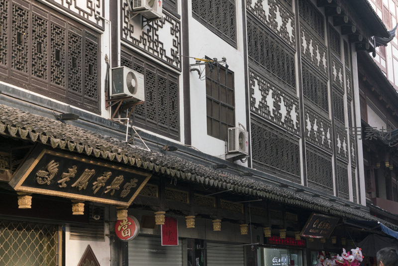古色古香的老街店铺门面,悬挂着黑底金字的牌匾,现代空调设备与传统建筑并存,展现了城市变迁中的文化传承。