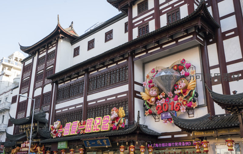 传统中式建筑外墙挂满红灯笼和2016猴年主题立体装饰,展现浓厚的节庆气氛与商业活力,吸引游客驻足观赏。