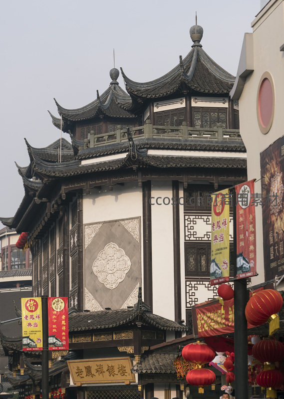 古塔式建筑层层叠叠的飞檐在灰白天空下格外醒目,红色灯笼与黄色招牌点缀其间,展现传统建筑美学与商业繁荣的融合。