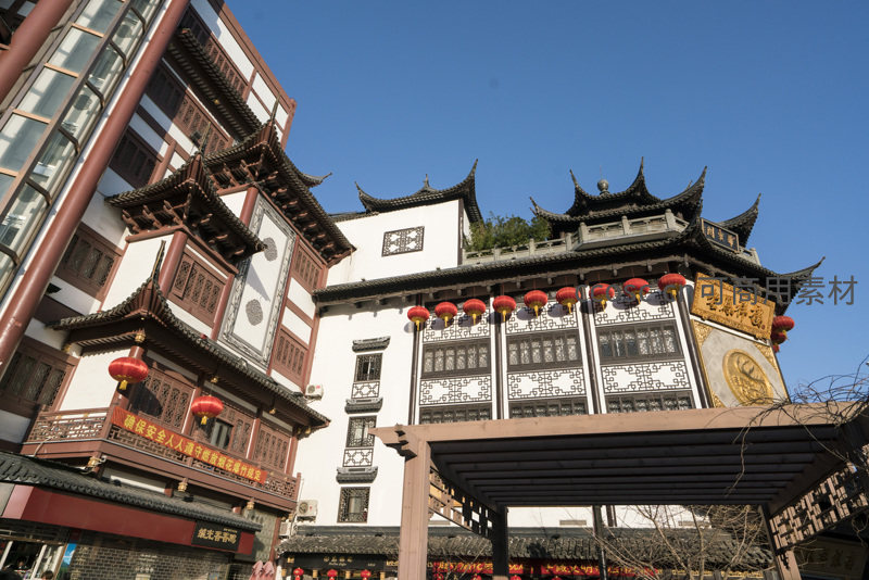 晴空万里下,古风建筑群错落有致,红色灯笼悬于屋檐,金漆牌匾熠熠生辉,构成一幅宁静而富有文化韵味的城市画卷。