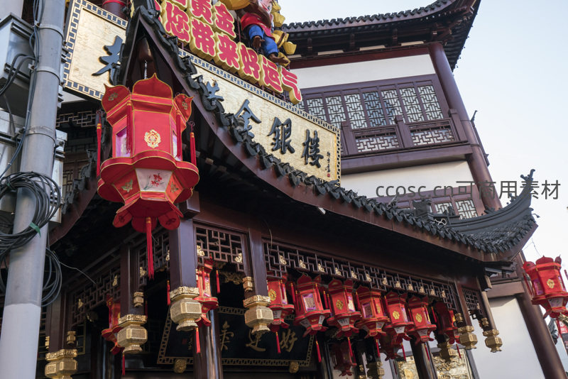 精致的木结构门楣上悬挂着“金银楼”金色大字牌匾,下方一排红灯笼随风轻摆,尽显传统商业建筑的富丽堂皇与节日喜庆。