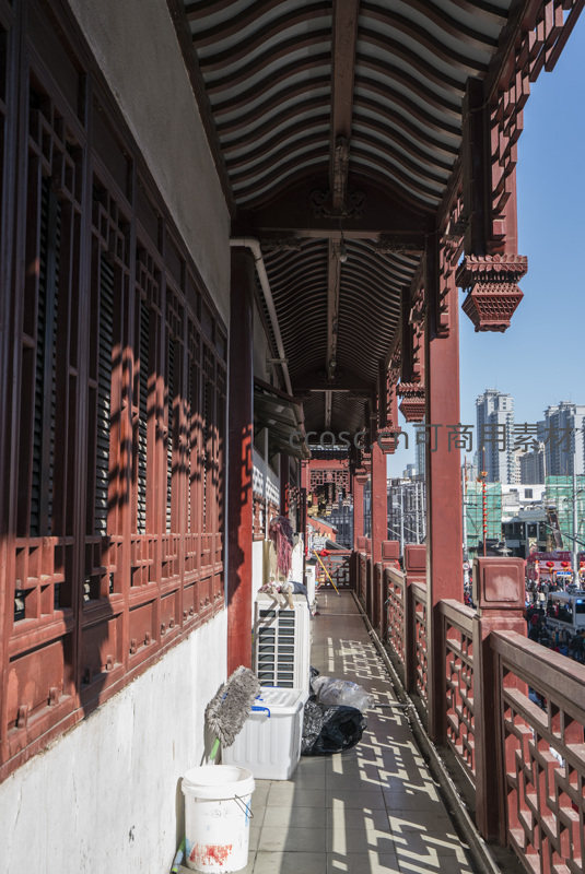 传统木结构长廊投下斑驳光影,远处现代高楼隐约可见,展现了老城厢与都市发展的奇妙融合,充满生活气息。