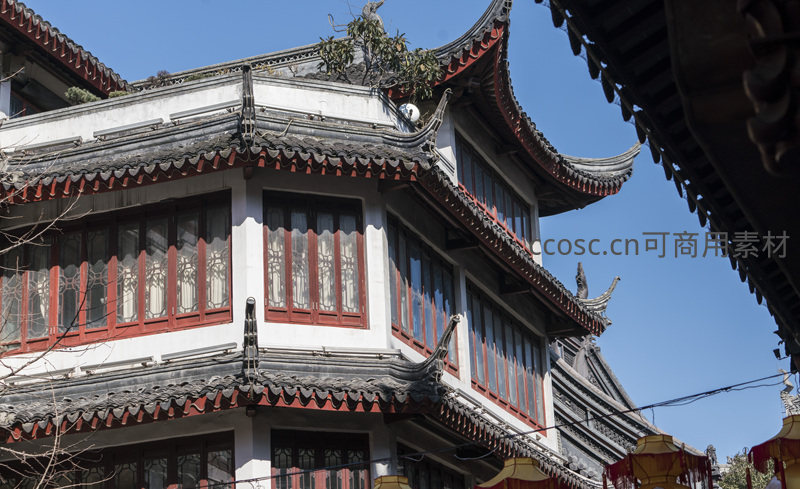 阳光下,中国传统建筑的飞檐翘角与蓝天相映成趣,白墙黛瓦、雕花窗棂和悬挂的红灯笼共同营造出浓厚的历史文化氛围。