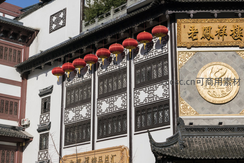 老字号“老凤祥”金漆牌匾悬于白墙之上,一排鲜红灯笼沿屋檐垂挂,配以精致镂空窗格,尽显传统商业街市的繁华与喜庆气息。