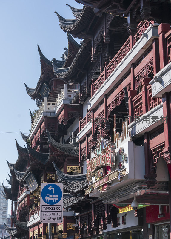 传统中式建筑群在晴朗天空下展现出精美的飞檐翘角与雕梁画栋,红墙白壁与现代高楼形成鲜明对比,体现古今交融的城市风貌。