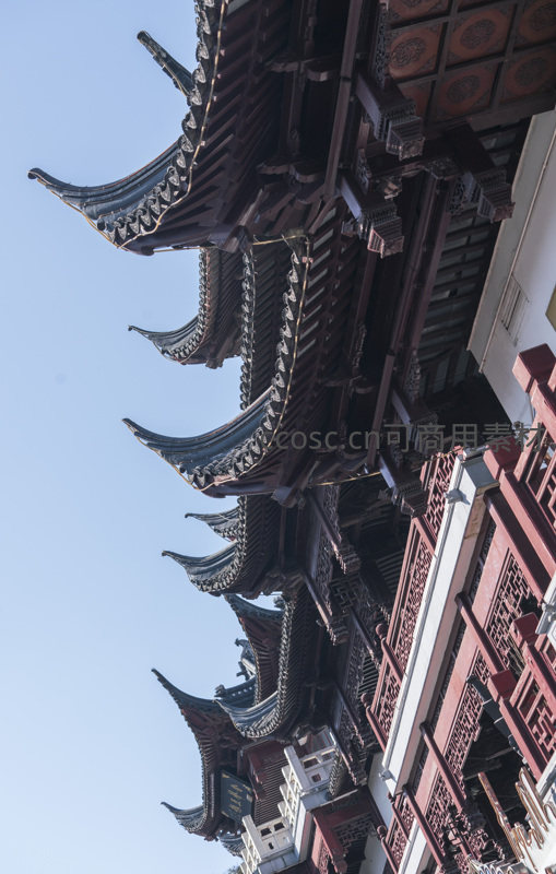 从低角度仰拍传统中式建筑的层叠飞檐,在蓝天映衬下更显气势恢宏,屋脊线条流畅优美,展现古代工匠精湛技艺与建筑美学的永恒魅力。