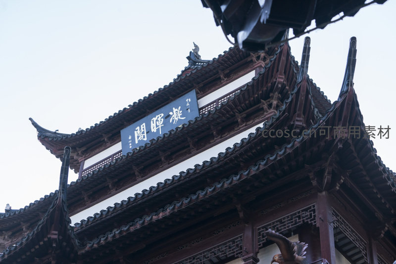 仰拍视角下,古塔层层叠叠的飞檐与精致的斗拱结构尽显传统建筑之美,匾额上的书法更添文化韵味。