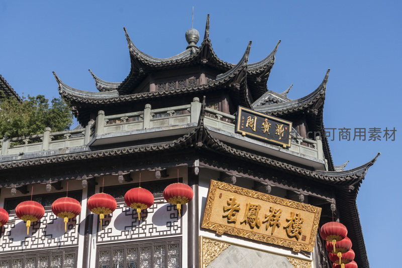 蓝天映衬下,古色古香的楼阁挂满鲜艳红灯笼,金色牌匾熠熠生辉,营造出浓厚的传统节庆氛围。